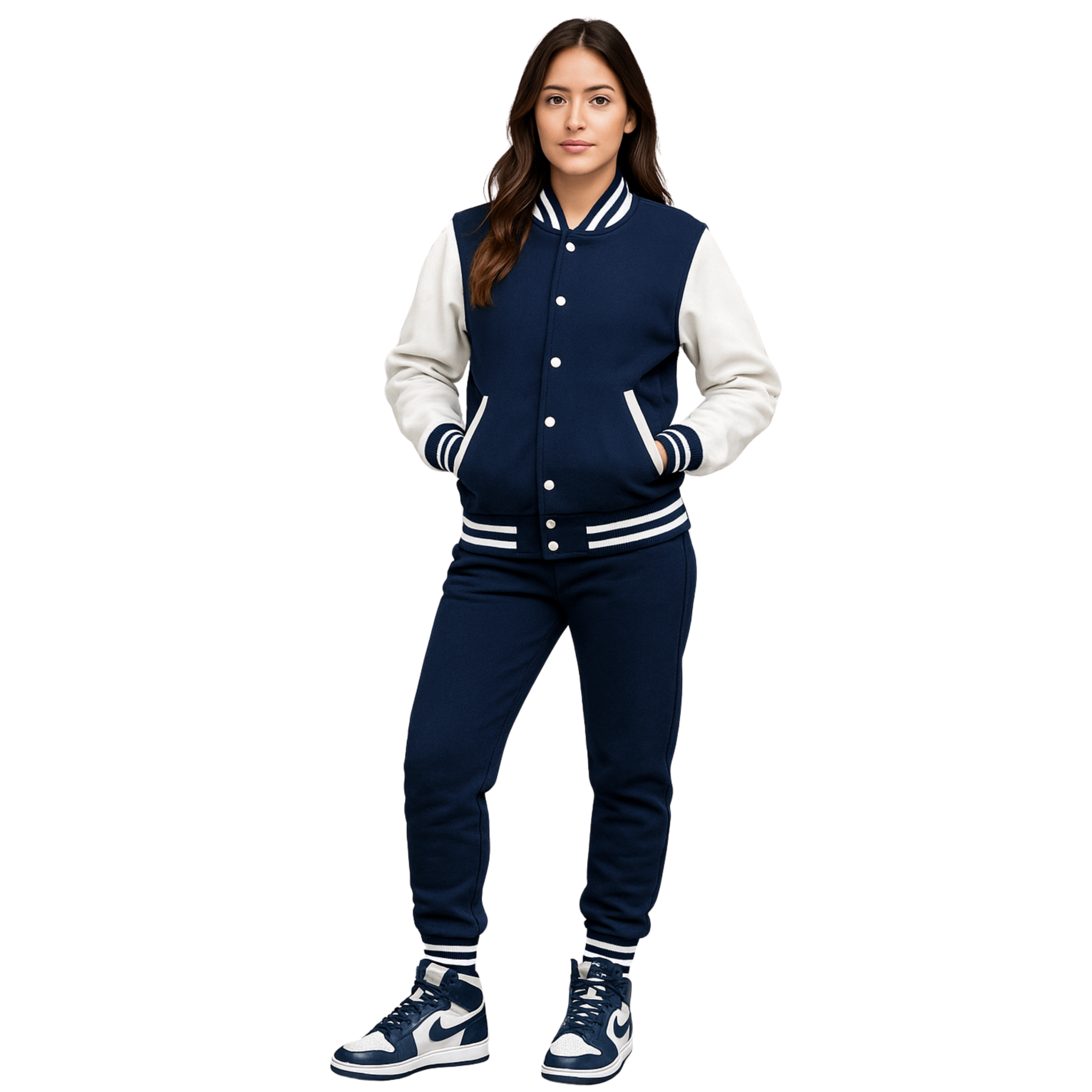 👕 Varsity-Style Design – Two-tone jacket with striped cuffs, waistband, and matching joggers.
